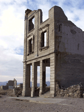 So why on earth is there a Nevada ghost town on a California Gold Rush site? Because Rhyolite was the queen of Death Valley’s gold boom. The town was the gateway to many California gold mining operations like Chloride City, Skidoo, Harrisburg and Keane.